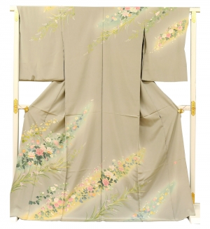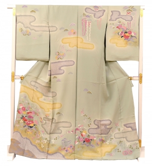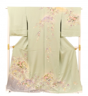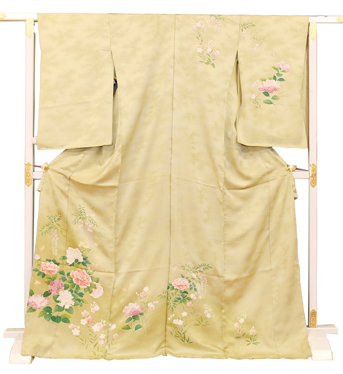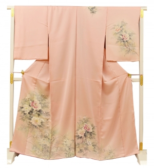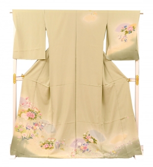 訪問着は縫い目をまたいでもひとつの絵のようにつながる美しい絵羽模様で、胸や袖といった上半身にも描かれておりとても華やかな着物です。