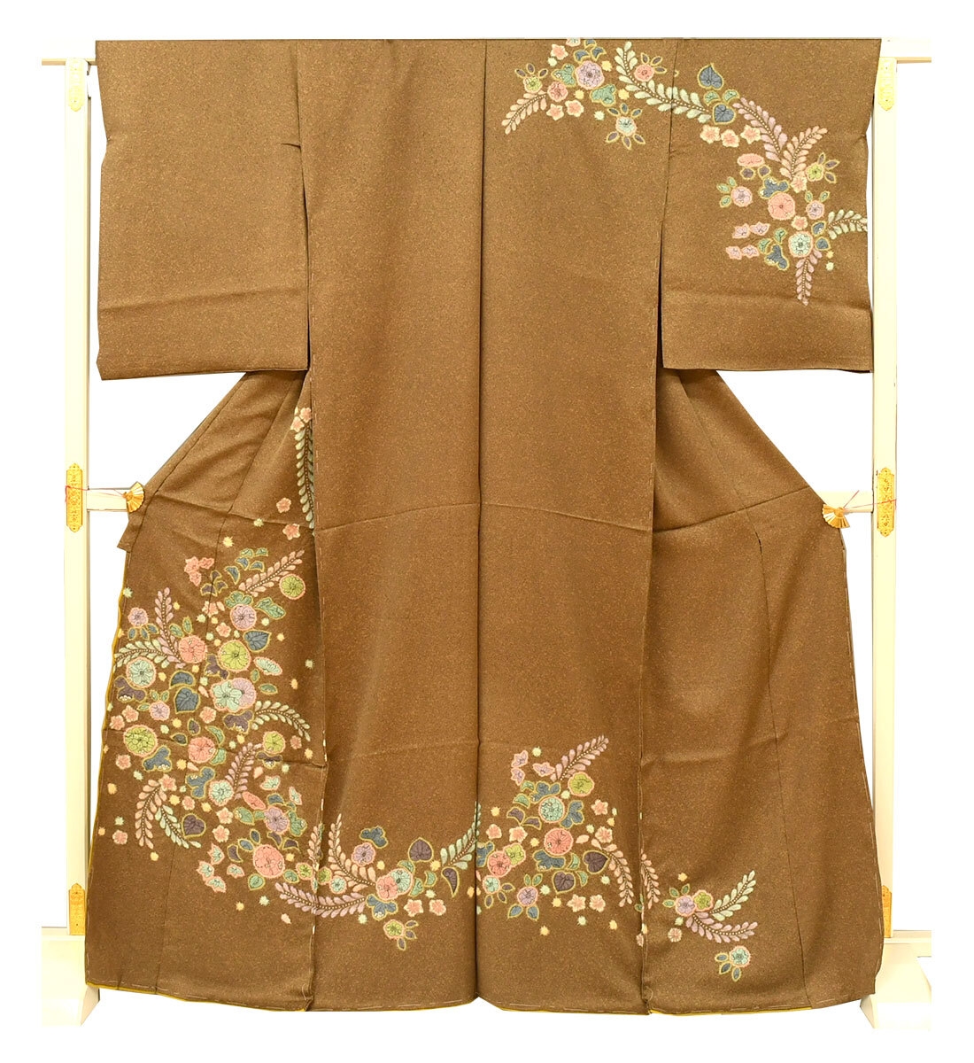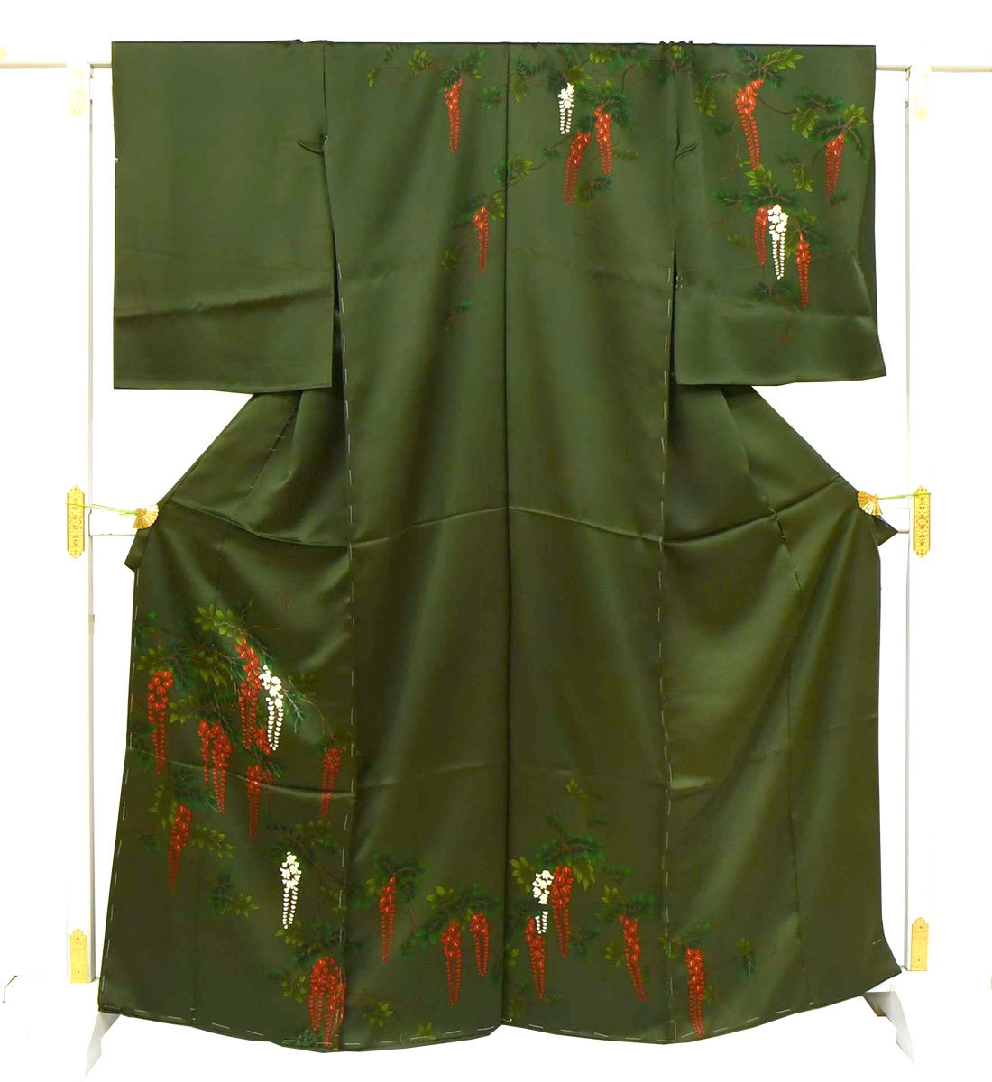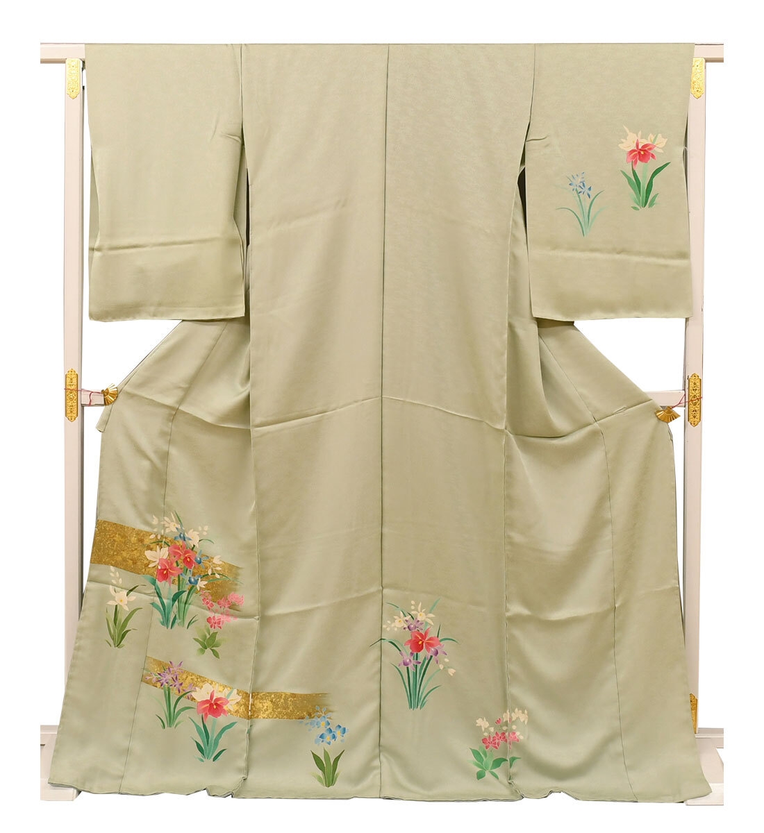 訪問着は縫い目をまたいでもひとつの絵のようにつながる美しい絵羽模様で、胸や袖といった上半身にも描かれておりとても華やかな着物です。