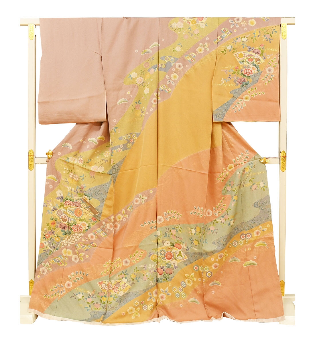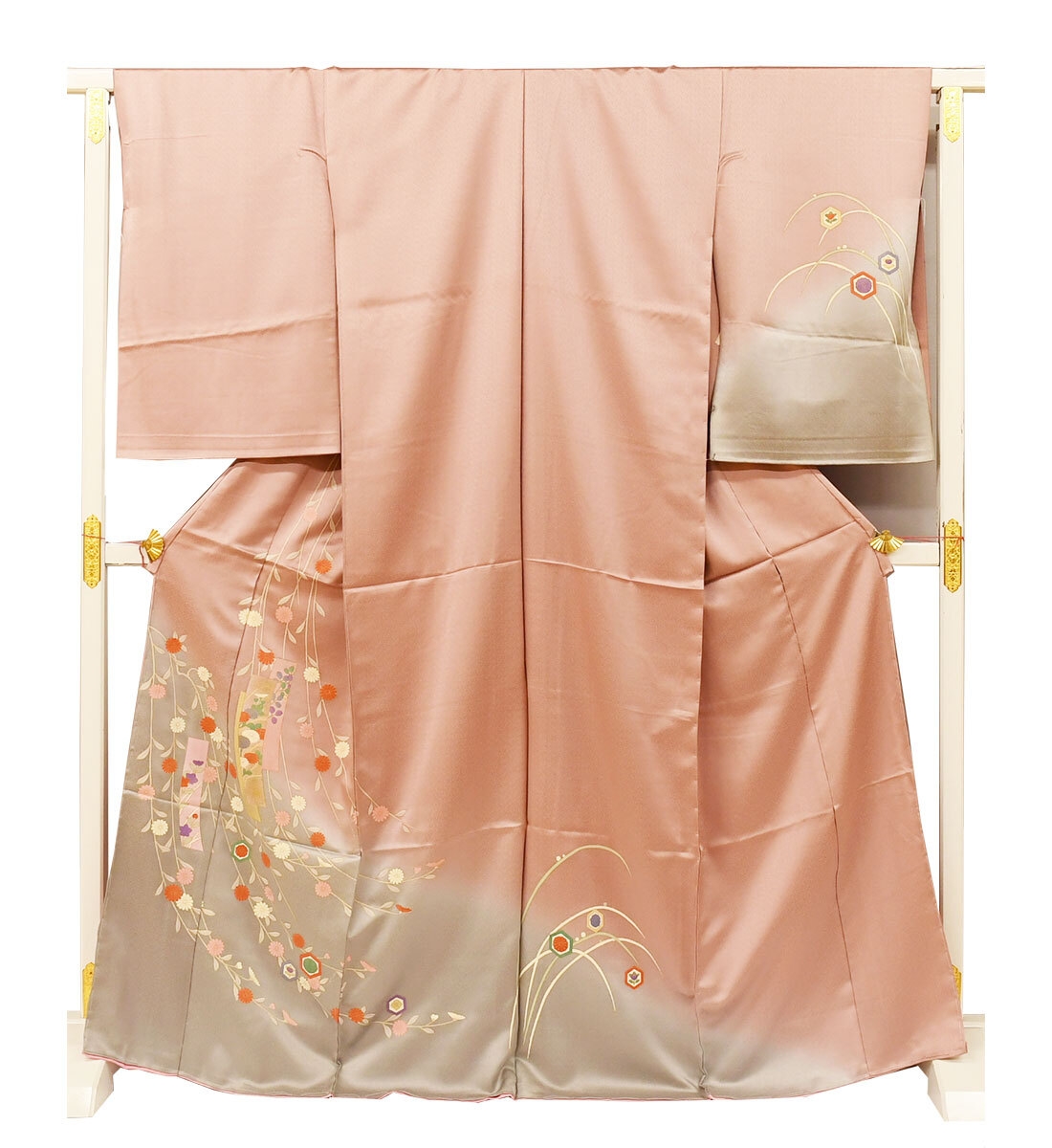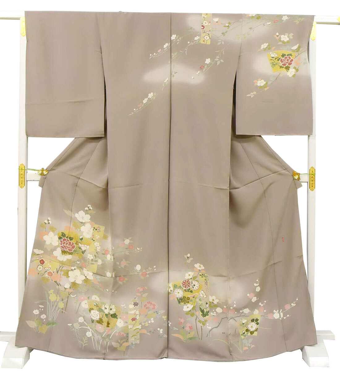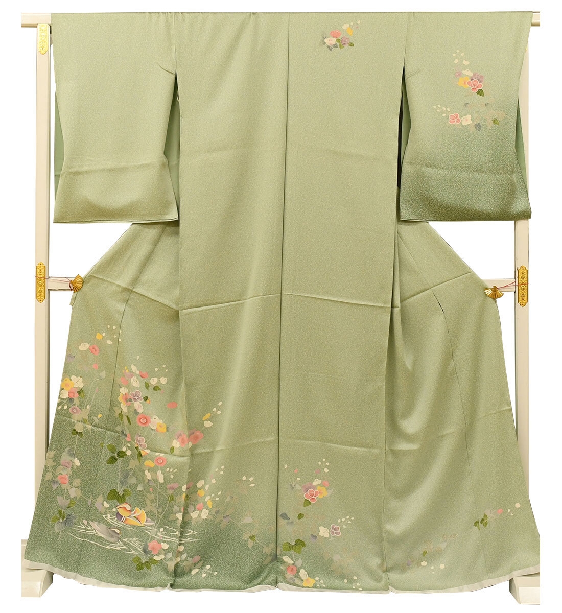 訪問着は縫い目をまたいでもひとつの絵のようにつながる美しい絵羽模様で、胸や袖といった上半身にも描かれておりとても華やかな着物です。