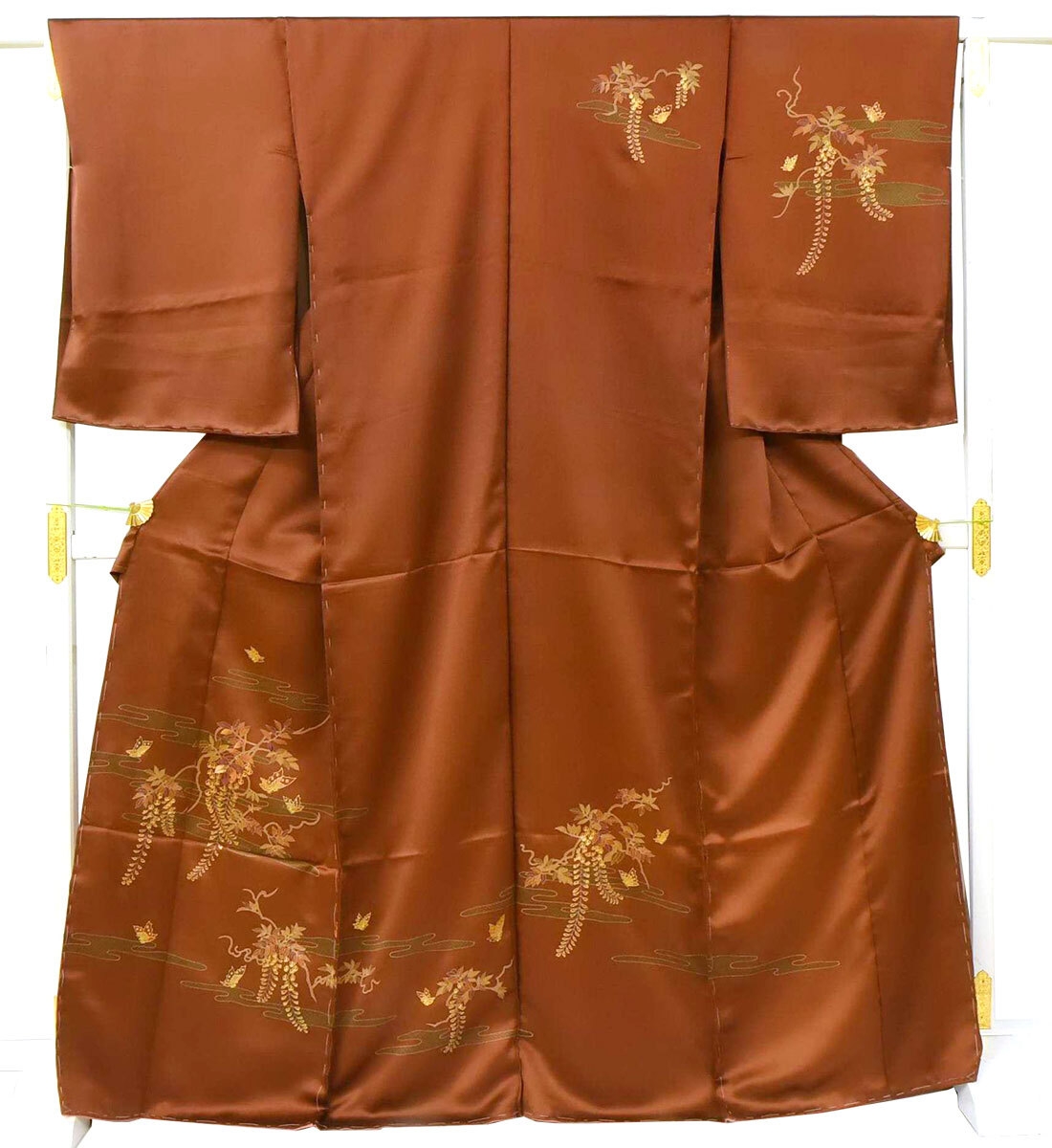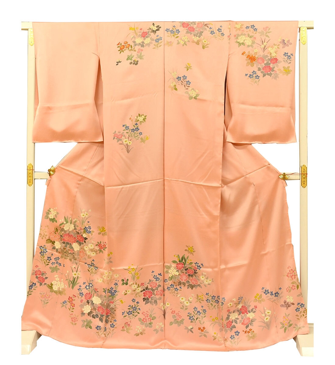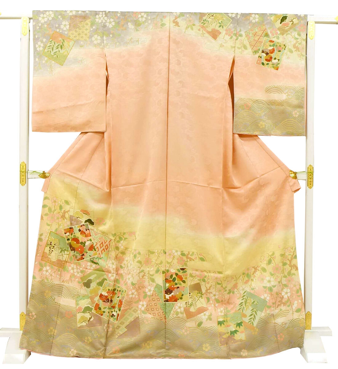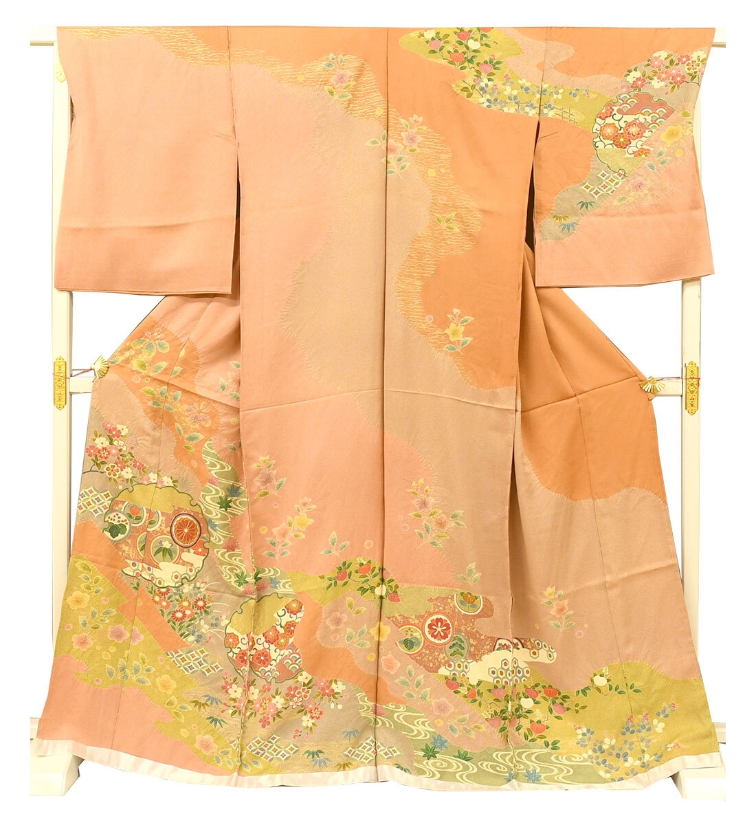 訪問着は縫い目をまたいでもひとつの絵のようにつながる美しい絵羽模様で、胸や袖といった上半身にも描かれておりとても華やかな着物です。