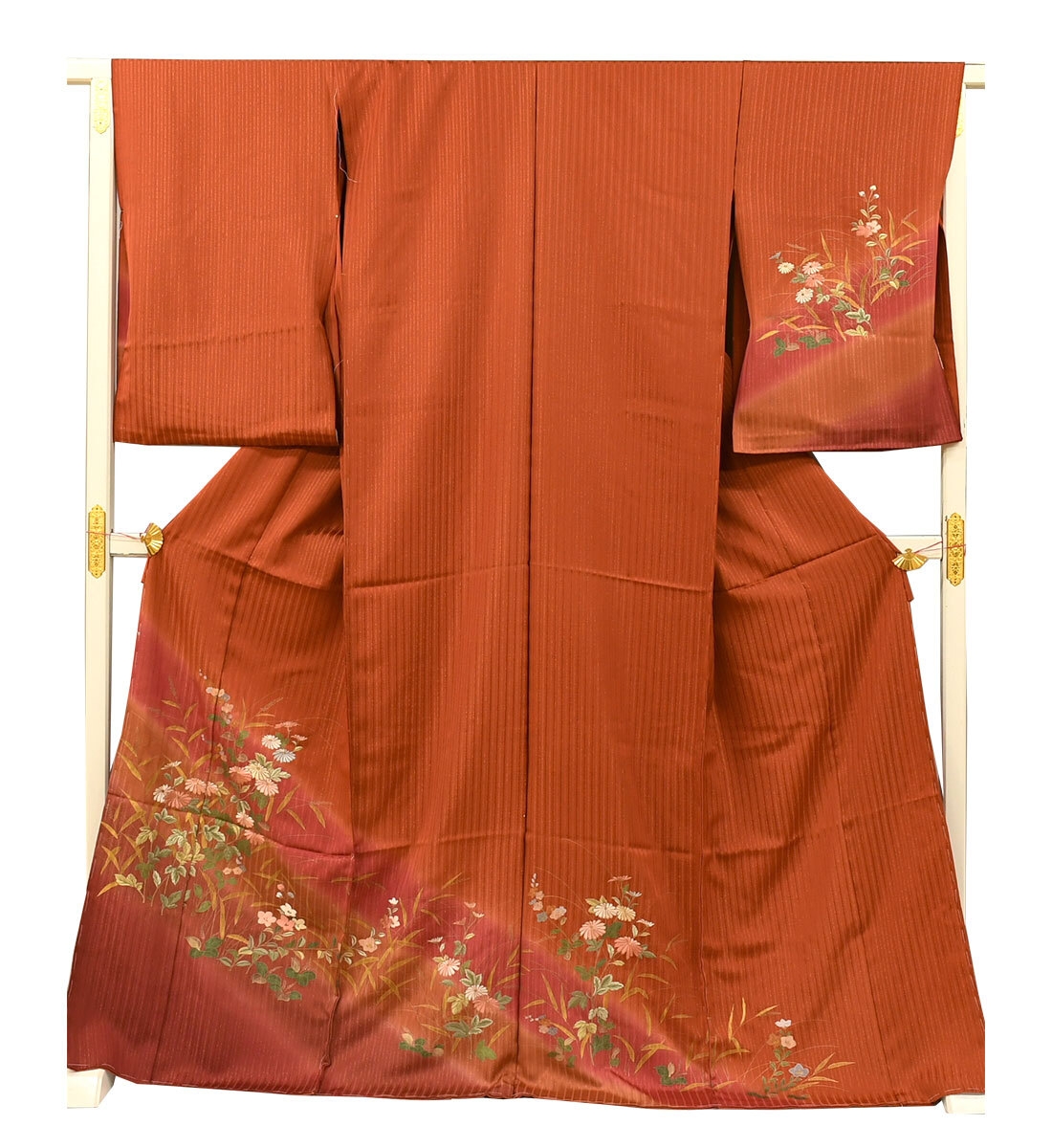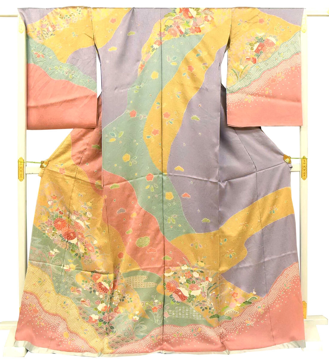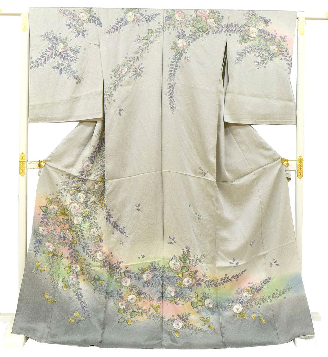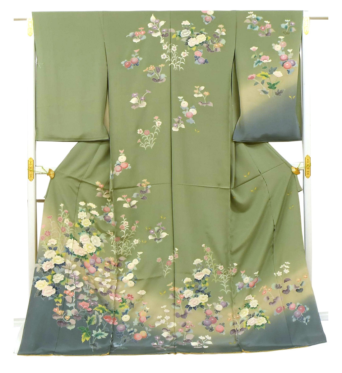 訪問着は縫い目をまたいでもひとつの絵のようにつながる美しい絵羽模様で、胸や袖といった上半身にも描かれておりとても華やかな着物です。